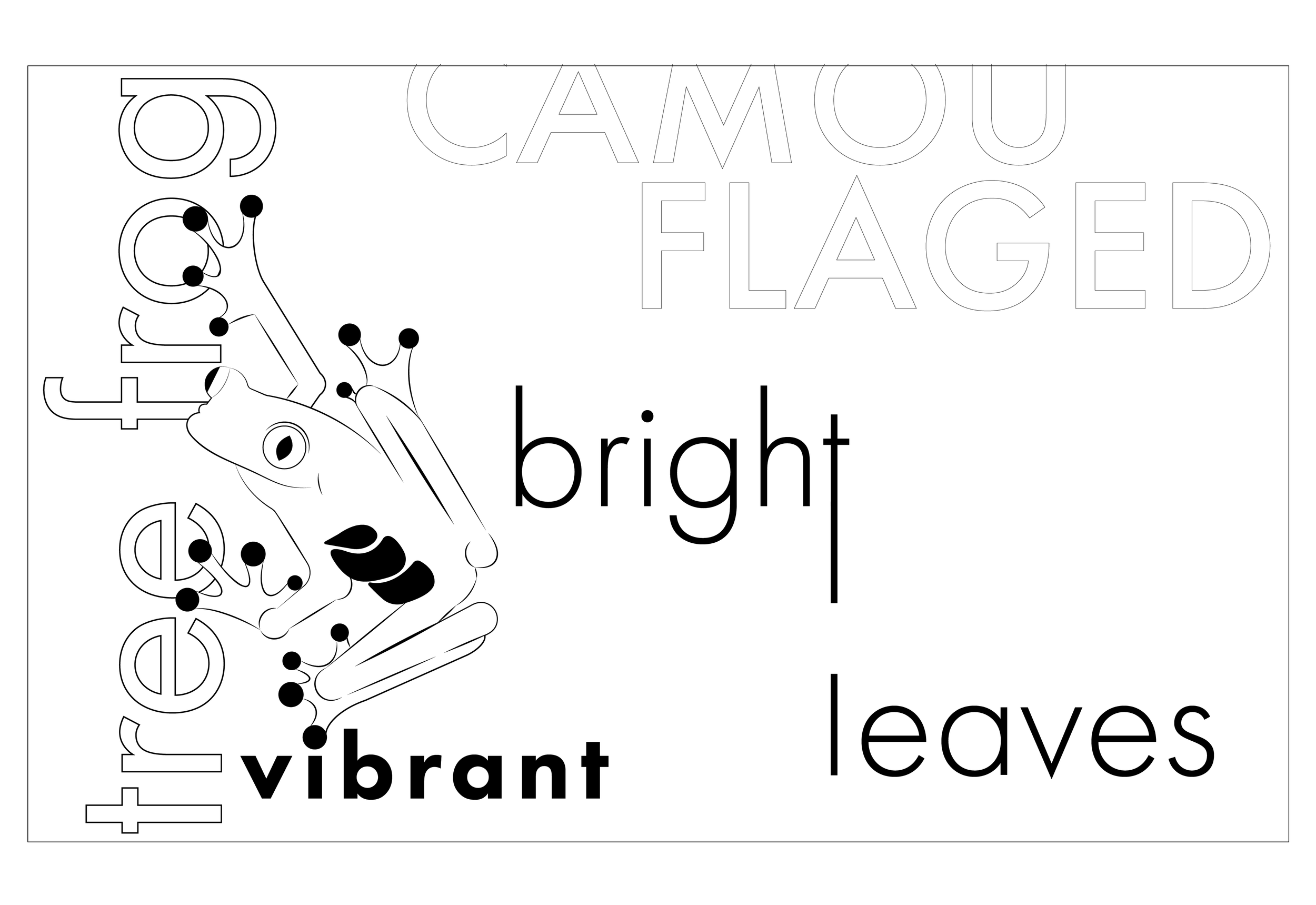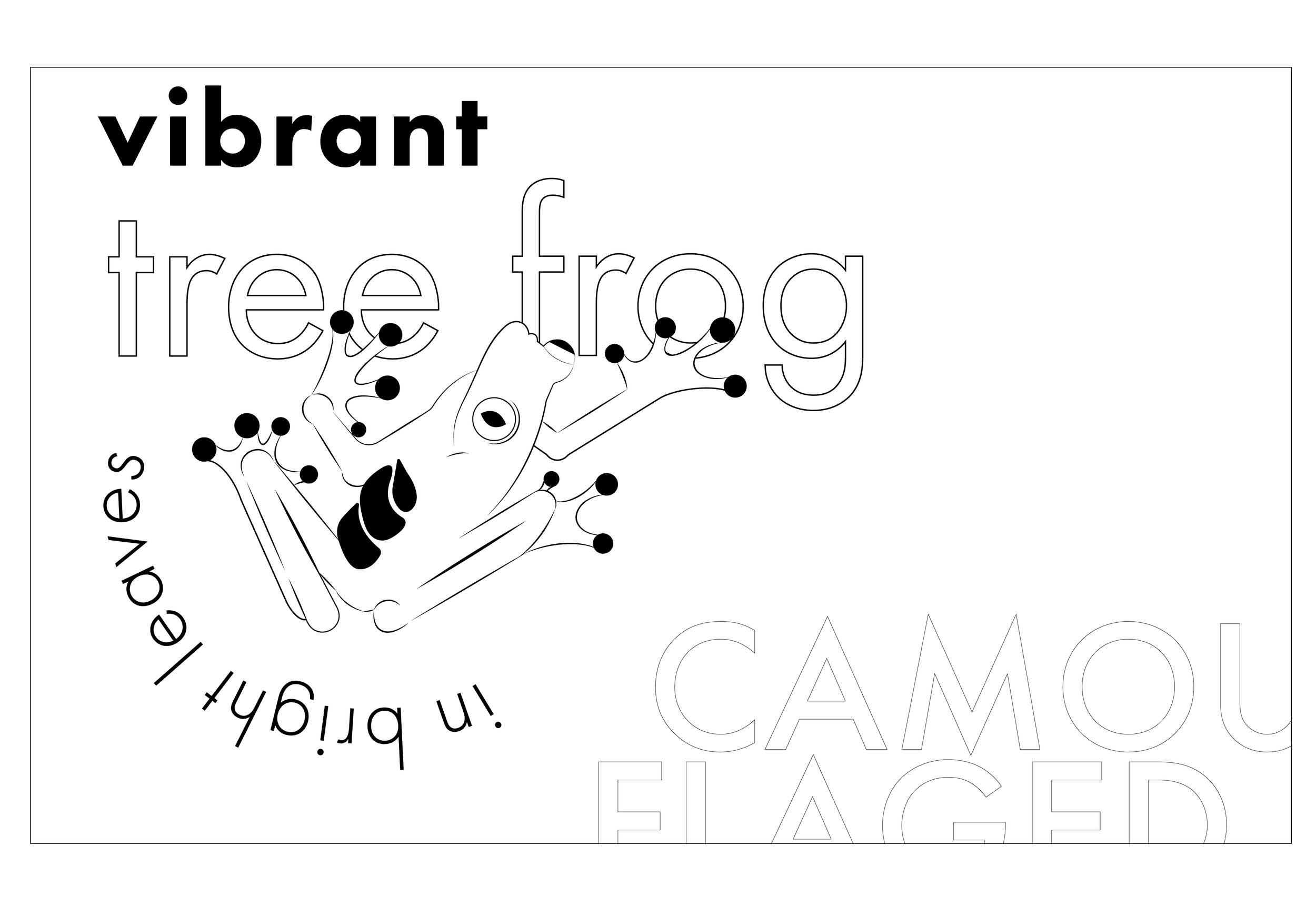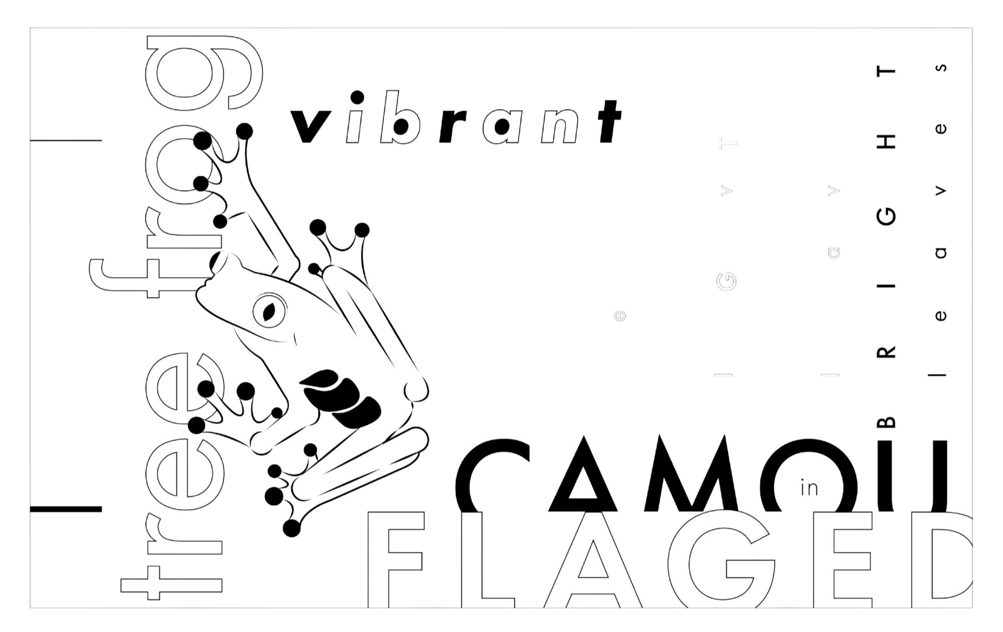 Since tree frogs are known for their ability to climb trees, the goal was to reflect this creature’s special ability. The interpretive phrase aims to put the viewer into a “typographic rainforest” where the tree frog lives and camouflages from predators.