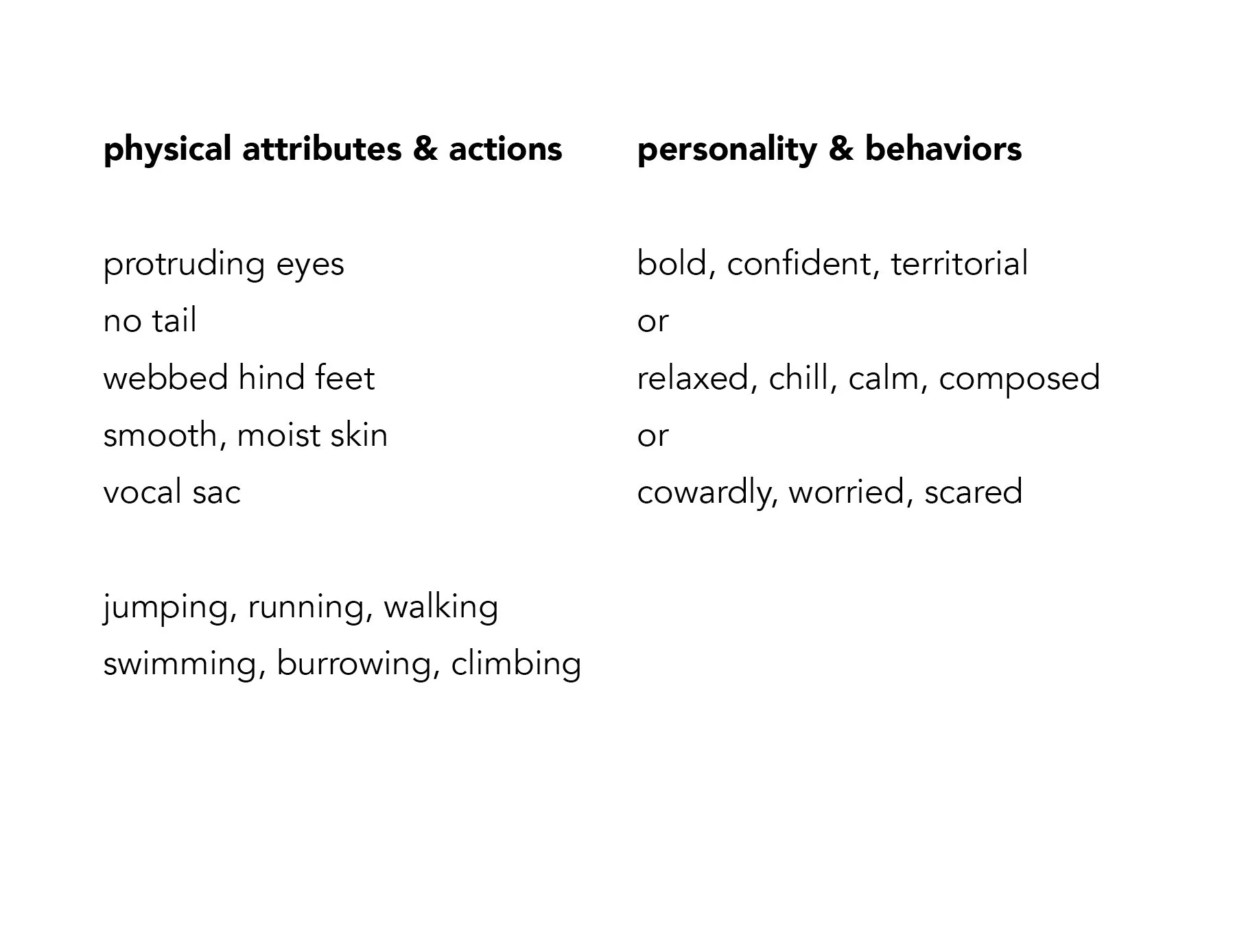 I chose a tree frog for its distinctive padded toes and natural ability to cling to surfaces—perfect for a visually engaging pose within my composition. I studied reference images to understand its anatomy and brainstormed key physical and behavioral traits to highlight its uniqueness.