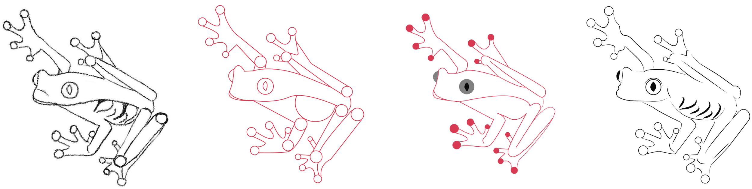 For the final deliverable, I decided to include implied lines to convey simplicity, tapered strokes for depth, and filled-in ellipses for the tree frog’s toes to emphasize their vital importance in the animal’s life.